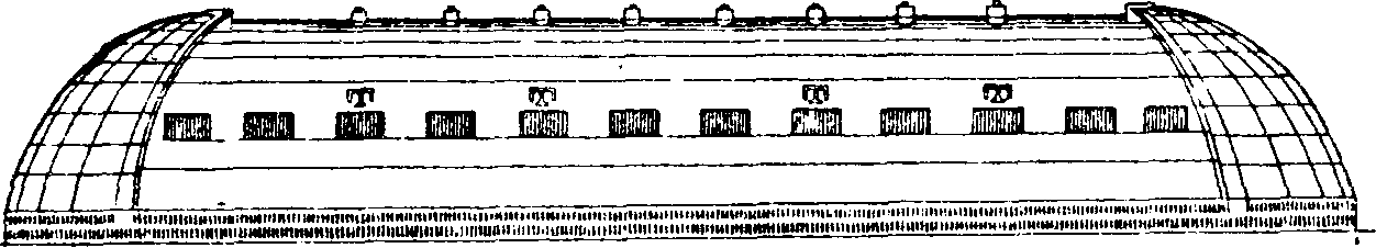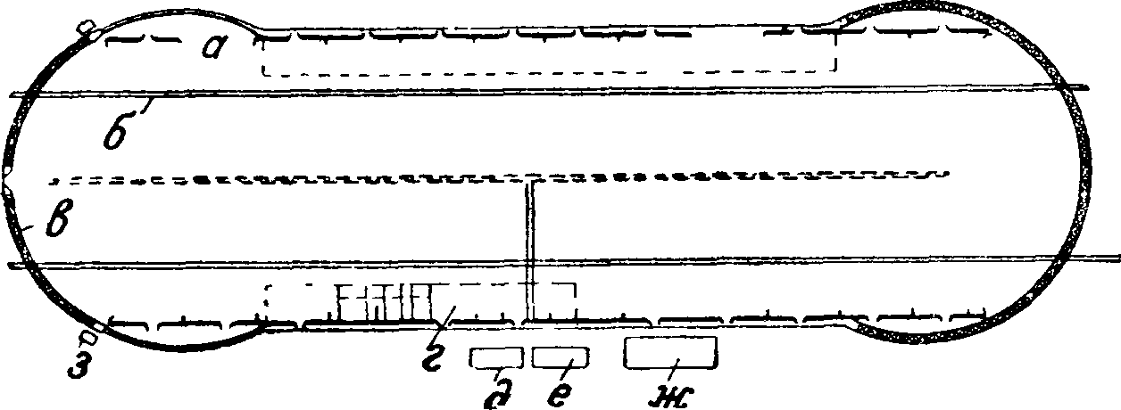 сотой 17 ж, на которые шарнирно опираются арки (фигура 11). Другой особенностью нового Э. является меньший запас площади пола между наружной поверхностью дирижабля и внутренней поверхностью Э., что объясняется отсутствием сборочных мастерских. Пространство под А-образными рамами использовано для складов и небольших ремонтных мастерских. Сборка этого элинга была произведена посредством установленного на 8 ж.-д. платформах подвижного деревянного башенного крана весом 500 ш, снабженного выносными стрелами. Движущий механизм в виде двигателя и лебедки располагался позади крана. Сборка крана была произведена в 18 дней.
